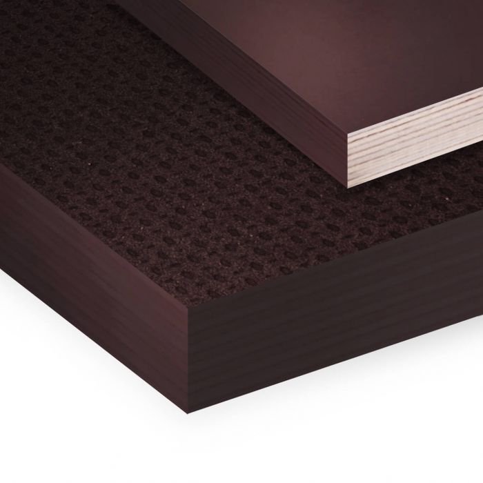 Door-en-door berken beton multiplex, beide zijden voorzien van een donkerbruine gladde fenol film (standaard 120 gr/m2).Geschikt voor beton waaraan eisen worden gesteld ten aanzien van gladheid klasse B.Andere coating dikte op aanvraag leverbaar, evenals andere kleuren als licht-bruin, zwart, geel, rood, groen. De coating kan zowel glad als met een anti-slip profiel worden geleverd.